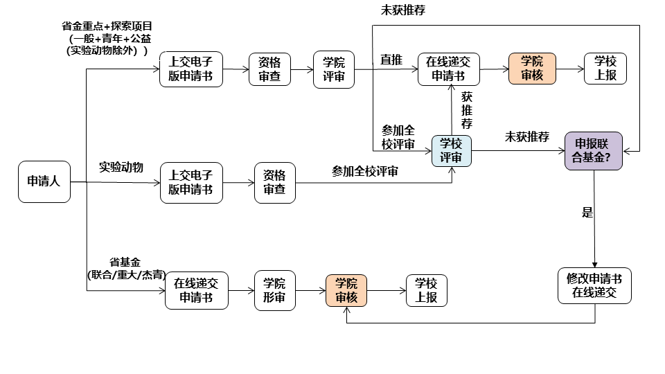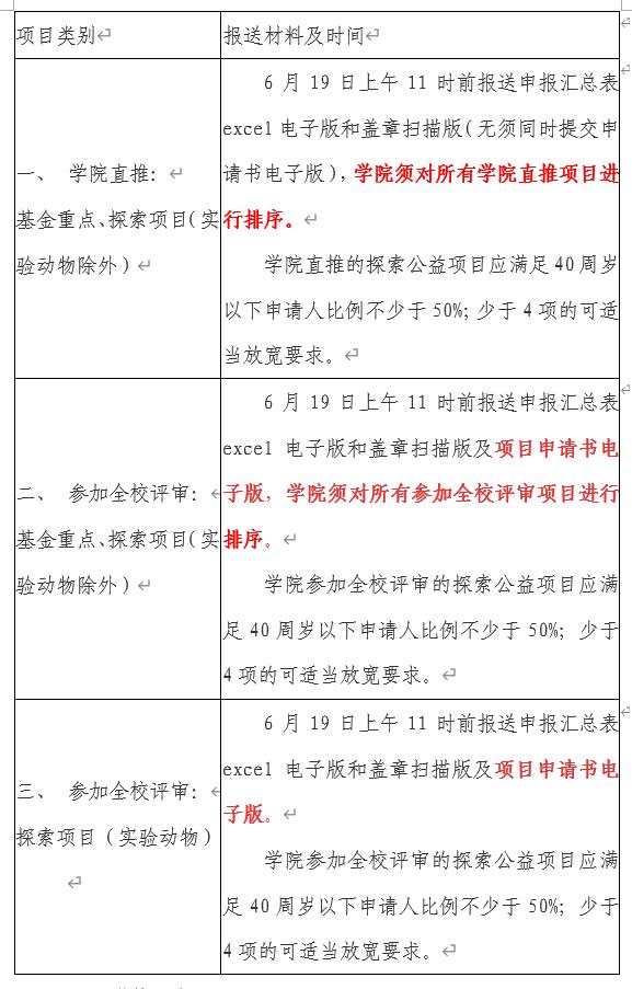 为更好发挥公司主体作用,提升项目的申报质量,公司将一定比例的基金重点和基金探索项目(不含实验动物)的限额数分配至各公司,由公司直推上报。同时,各公司以公司下达给公司参加全校评审的限额数为上限,推荐项目参加全校评审。探索公益项目中的实验动物项目单独下达限额,不纳入公司直推范畴,一并纳入全校评审,依据公司实验动物项目限额数评选出推荐项目。