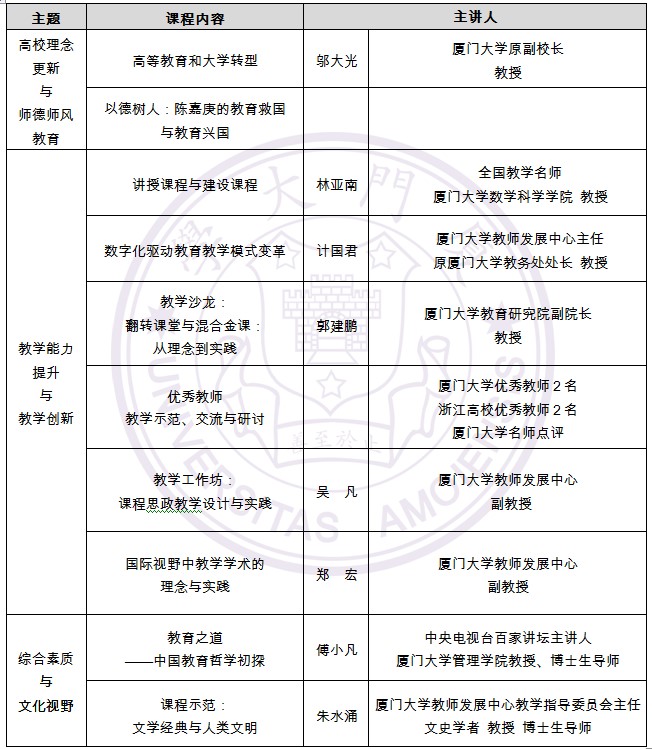 培训团队团队将由邬大光(全国著名高等教育专家、厦门大学原副董事长)、计国君(厦门大学教师发展中心主任)、傅小凡(中央电视台百家讲坛主讲人)等组成。