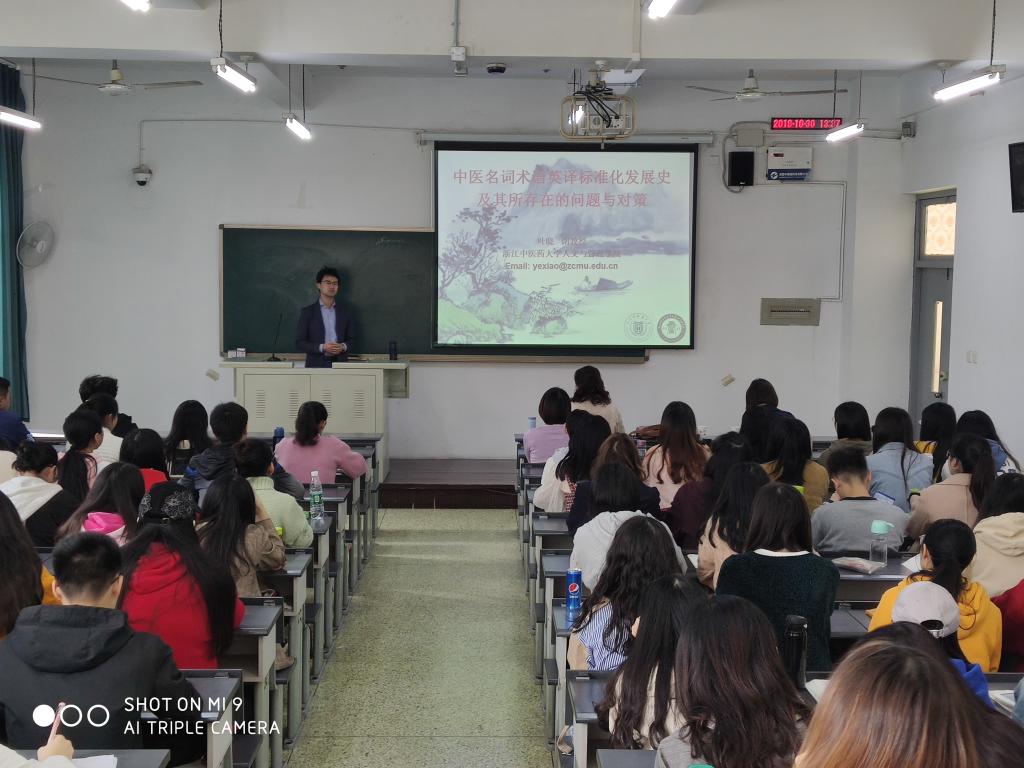 为了学习该公司和相应教研室的先进经验,叶晓和唐路老师对本硕士生的医学/学术英语课程设置情况、团队培养情况、教学和科研团队建设情况、教研室管理制度和执行情况和教研室党支部建设情况等方面进行了深入调研,对部分医学英语课程进行了随堂听课。此外,叶晓副教授还受邀为该公司2017级英语专业员工作了一场题为“中医名词术语英译标准化发展史及其所存在的问题与对策”的学术讲座,受到现场师生的积极参与和一致好评。
