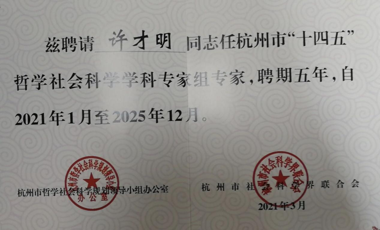 近期,许才明教授被聘任为杭州市“十四五”哲学社会科学学科专家组专家,聘期五年,聘任时间为2021年1月至2025年12 月。