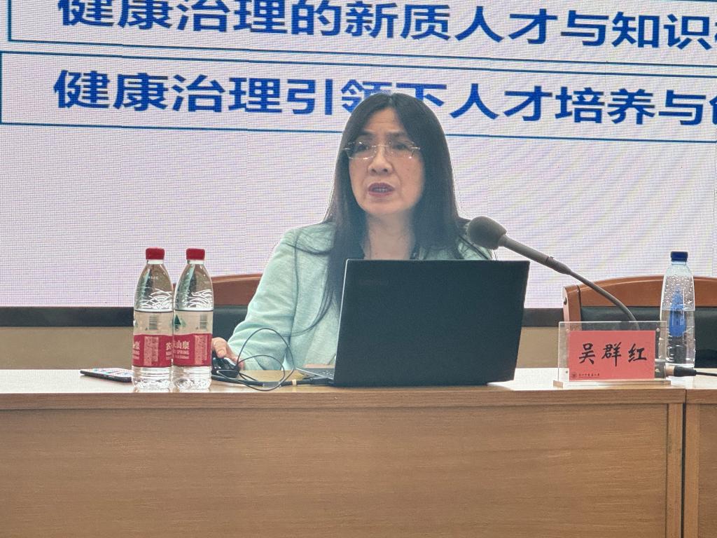 讲座伊始,吴群红教授深入剖析了健康科学为何要突出治理的重要性。她从人类科学发展的路径出发,结合知识发展趋势和当前过于关注学科的垂直分化,而忽视了学科间的网络交叉等现状,引出实践过程中诸多弊端。深入浅出地向健康科学领域需要引入治理理念,通过跨学科的合作与交流,打破学科壁垒,促进知识的融合与创新,以更好地应对健康领域的复杂挑战。接着,吴教授详细阐述了健康治理学的概念与内涵。随着健康领域问题的日益复杂和多样化,原有的医学知识体系已经面临诸多挑战。健康治理学的核心目标与理念是以人民为中心,以全民健康为最终目标,通过科学的管理和决策手段,实现健康资源的优化配置和高效利用。这一理念不仅关注个体的健康需求,更强调从整体上提升全民的健康水平。在谈到健康治理的新质人才与知识模块时,吴群红教授强调了健康治理科学的价值与意义。她指出,新质人才应具备跨学科的知识背景、创新思维和实践能力,能够灵活应对健康领域的复杂问题。为了培养这样的新质人才,需要构建包含公共卫生、管理学、信息技术等多个知识模块的课程体系,以培养员工的综合素质和实践能力。同时,吴教授还探讨了健康治理新质人才的概念、内涵、核心特质与能力,为师生们提供了清晰的人才培养目标。