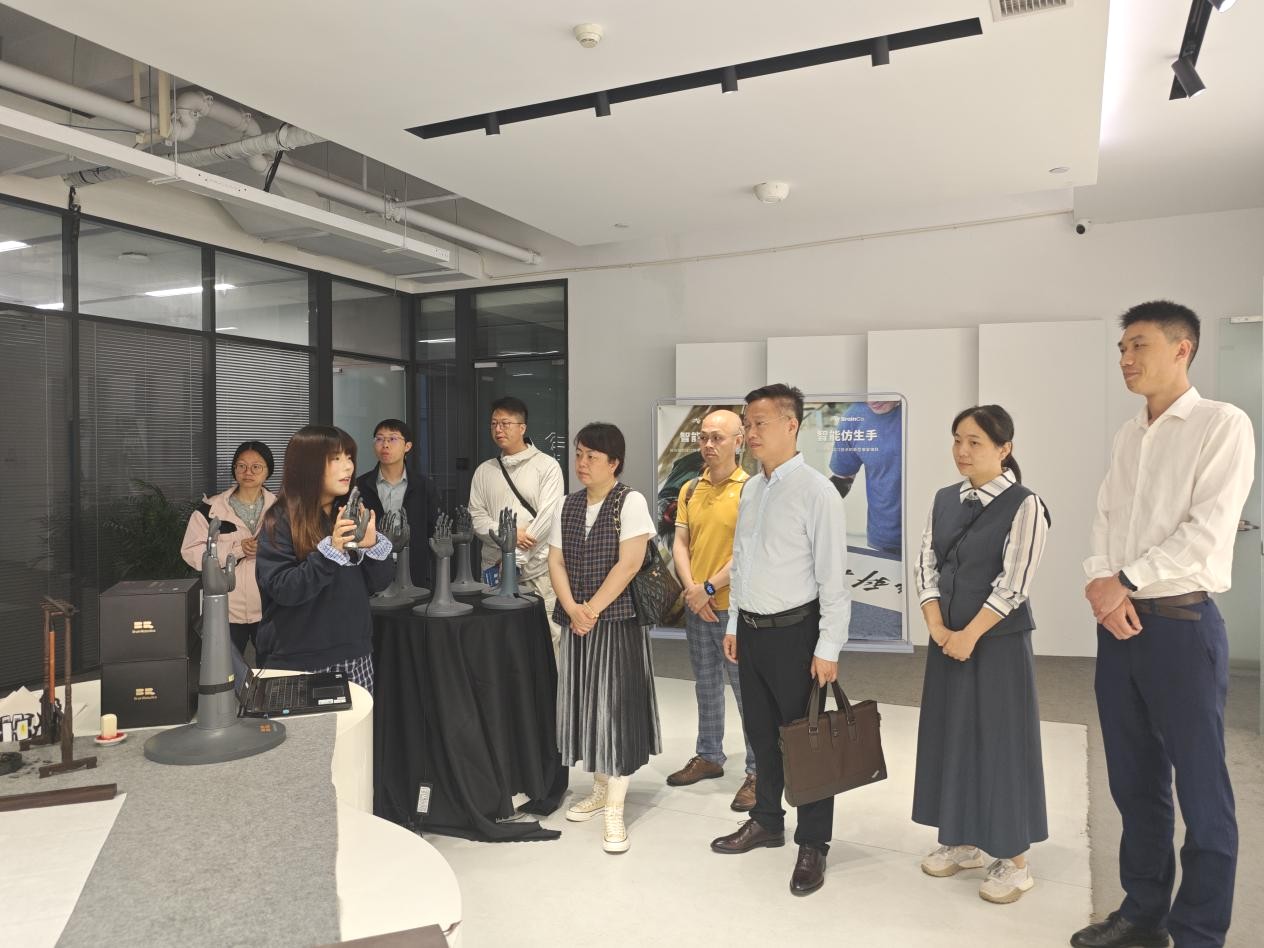 在强脑科技政府合作部负责人谭刚的陪同下,调研团队参观了企业展厅及研发中心,深入了解公司在脑机接口、人工智能、智能康复等领域的核心技术成果。讲解员重点展示了非侵入式脑机接口产品在教育、医疗、健康管理等场景的应用案例,例如帮助残障人士实现肢体控制的智能仿生手、帮助孤独症儿童提升专注力的智能学习头环等。