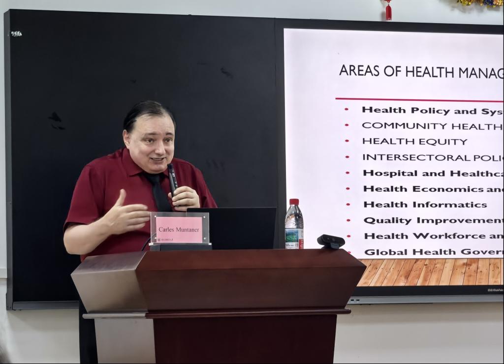 首场讲座由加拿大健康科公司院士、多伦多大学Carles Muntaner教授主讲,主题为“Health Equity and Intersectoral Action as Fundamental Constructs of Health Policy and Management”。Carles Muntaner教授作为健康平等与社会流行病学领域的权威专家,曾担任世界卫生组织健康问题社会决定因素委员会专家。在讲座中,他深入剖析了健康公平与跨部门协作在健康政策制定与管理中的核心地位,分享了其团队在社会决定因素对健康影响方面的最新研究成果,为在座师生带来了国际前沿的学术视角。