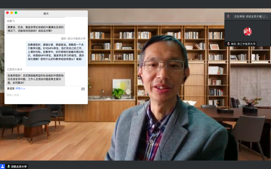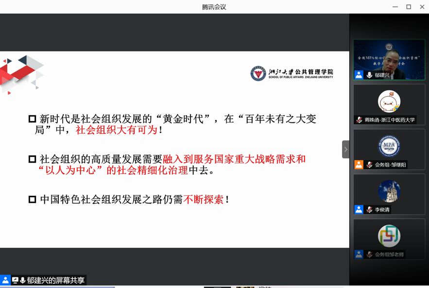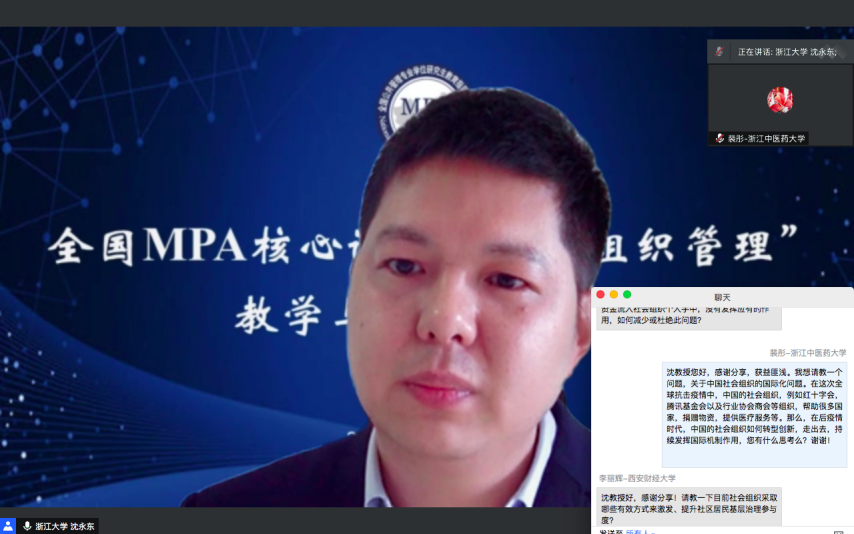 会中,与会专家就MPA专业学位研究生指导中遇到的问题进行了深入坦诚的交流。公司参会教师踊跃提问:蒋姝函博士向教指委委员、浙江工商大学董事长郁建兴教授提问:综合监管强调社会组织党建,是否有利于达成“政社分开“这一社会组织发展总目标?社会组织的自主性如何获得?裴彤博士针对疫情发生后中国社会组织国际化问题向浙江大学沈永东副教授提问,并结合MPA教学实践问题与北京大学田凯教授作了积极交流