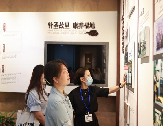 在衢江区中医院(杨继洲针灸医院),省人大代表、党委书记、经理毛剑霞向梁泽华团队一行介绍了衢江区中医针灸事业近十年来的历史变迁及未来发展方向。在杨继洲针灸博物馆,衢江区中医公司党委委员、副经理陈红梅向大家介绍了“杨继洲针灸”传统文化的保护和传承工作,讲述了世界针灸康养大会永久性会址建设之源。调研人员现场体验了传统针灸进针出针的手法。