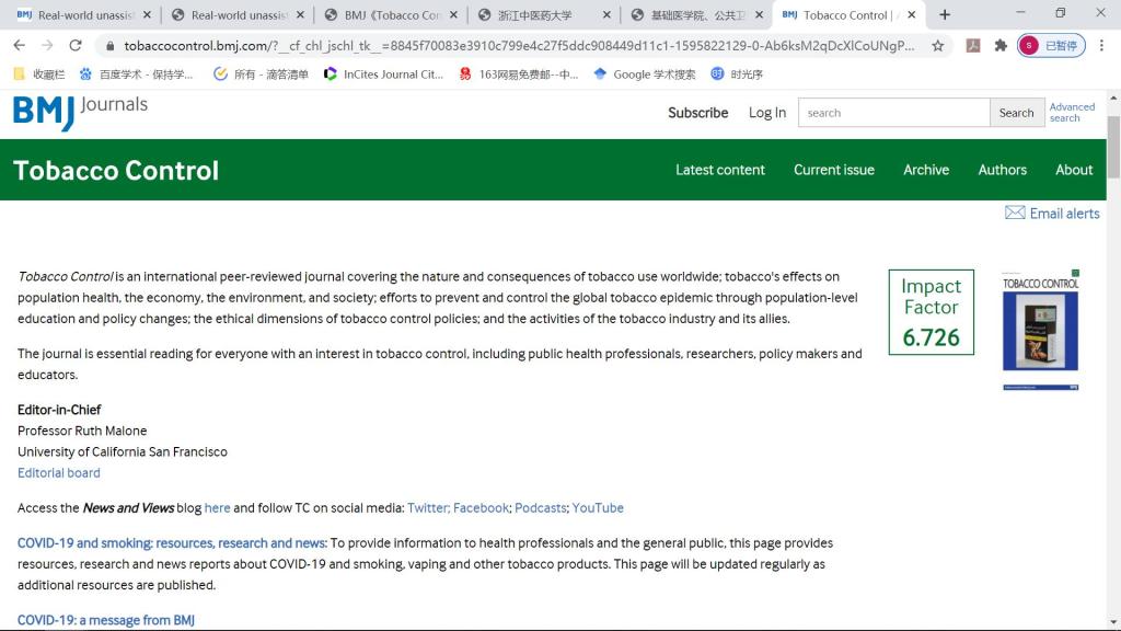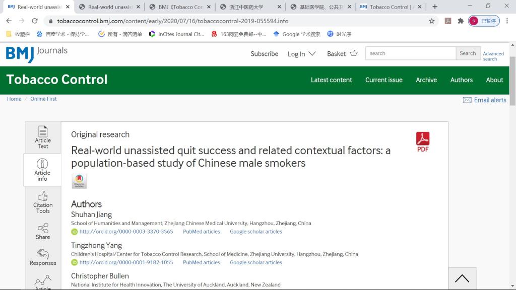 2020年7月16日,K1体育与浙江大学控烟研究中心在BMJ Tobacco Control上在线发表了题为“Real-world unassisted quit success and related contextual factors: a population-based study of Chinese male smokers”的文章,该杂志的影响因子为6.726,在SSCI物质滥用领域排名第1位,SSCI公共卫生领域排名第6位。