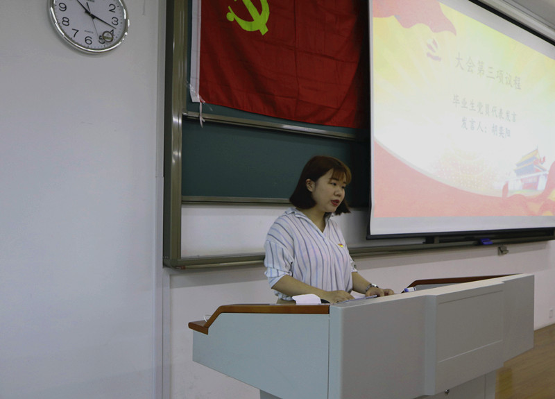 大会伊始,伴随着庄严肃穆的国歌声,全体毕业生党员起立、奏唱国歌。根据公司党委的文件要求和公司党总支的具体安排,郑国庭老师详细介绍党组织关系转移等相关事宜,并列出毕业生党员需要掌握的注意事项。同时结合公司《致2018届毕业生党员一封信》内容,要求毕业生党员坚定信仰,做好表率;踏实创新,勇于担当;感恩母校,走向未来,在任何时候要牢记党员身份,做文明离校、平安离校的榜样。随后,毕业生党员代表员工第四党支部胡奕阳发言,她分享了自己学习和成长经历的点点滴滴,希望全体毕业党员在未来的生活与工作中,勤奋学习,扎实工作,不辜负党组织的培养、教育以及老师们的教诲。最后,全体毕业生党员面向党旗,重温入党誓词,不忘初心,砥砺前行。