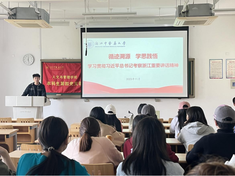 11月6日,本科生第四党支部学习贯彻习近平总书记考察浙江重要讲话精神宣讲会暨工作调研座谈会召开,学习宣传贯彻习近平总书记考察浙江重要讲话精神,汇报交流自主题教育开展以来支部工作情况,谋划短期未来工作思路和对策。会议由支部书记俞晓东主持,支部全体党员、预备党员、入党积极分子参加。